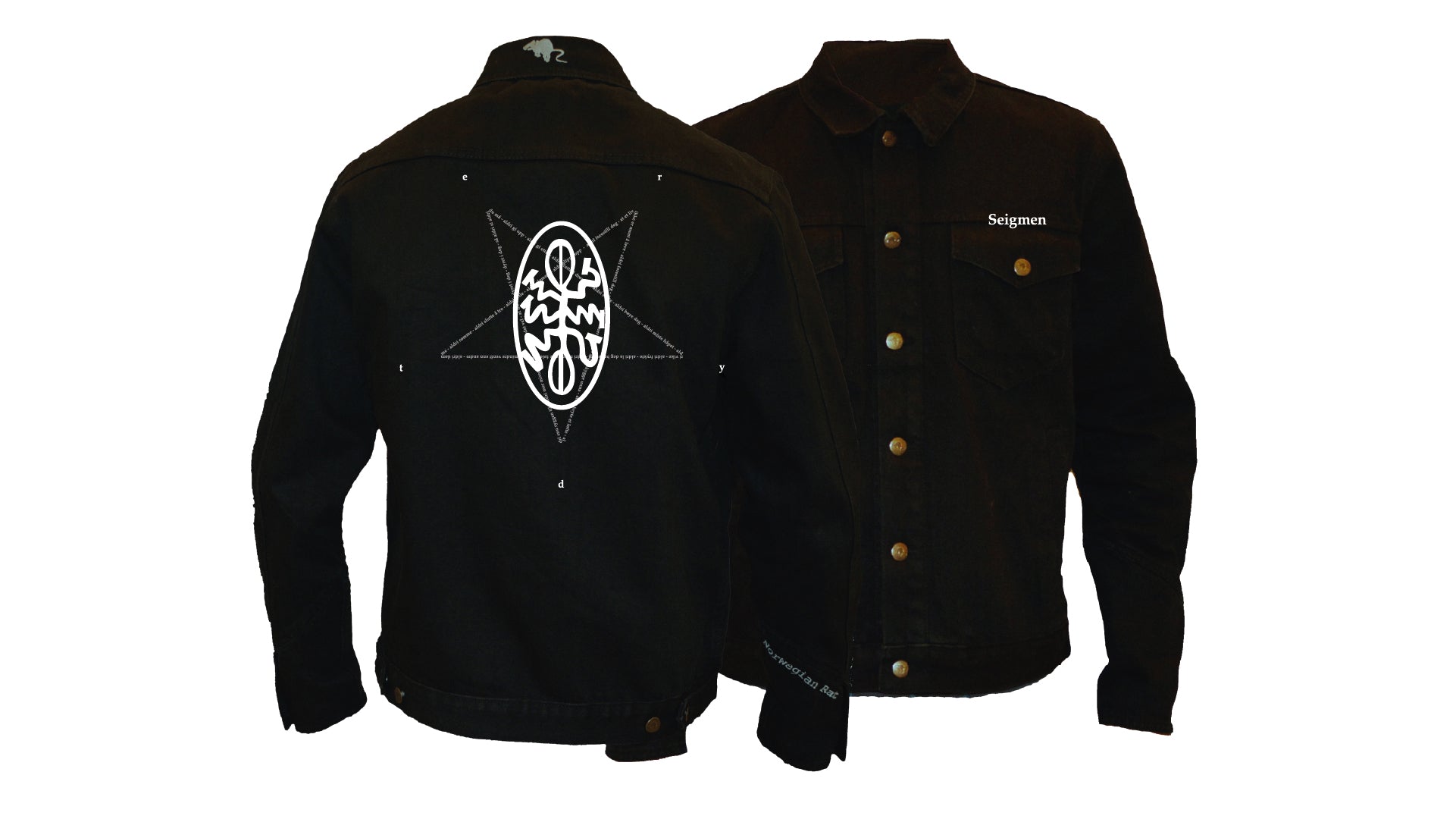 Thick, black, 100% official Seigmen denim jacket. Everything embroidered and with custom rat buttons and 8 pockets. Two of them with coarse zippers on the inside. This jacket is named after Halfdan the Black, a Norwegian viking earl who drowned in the lake Randsfjorden when his horse and sleigh broke through the ice.