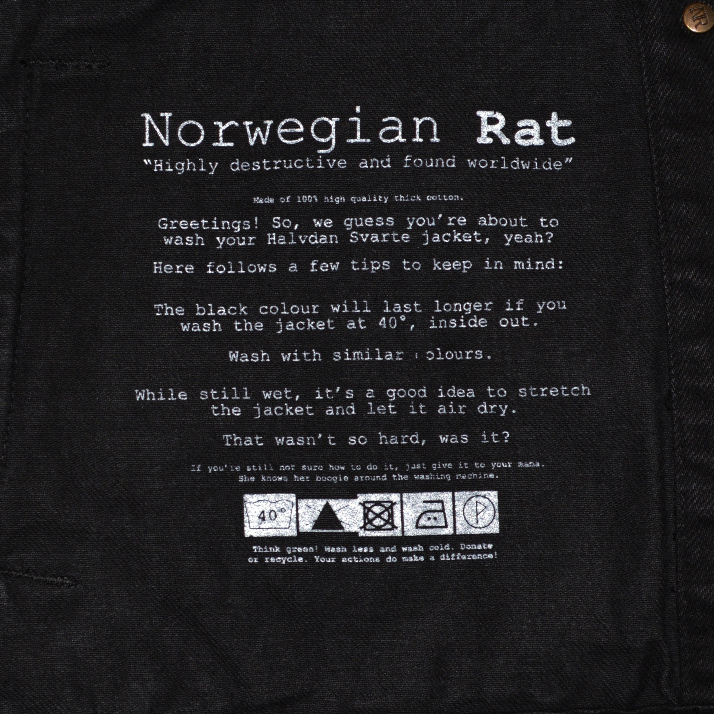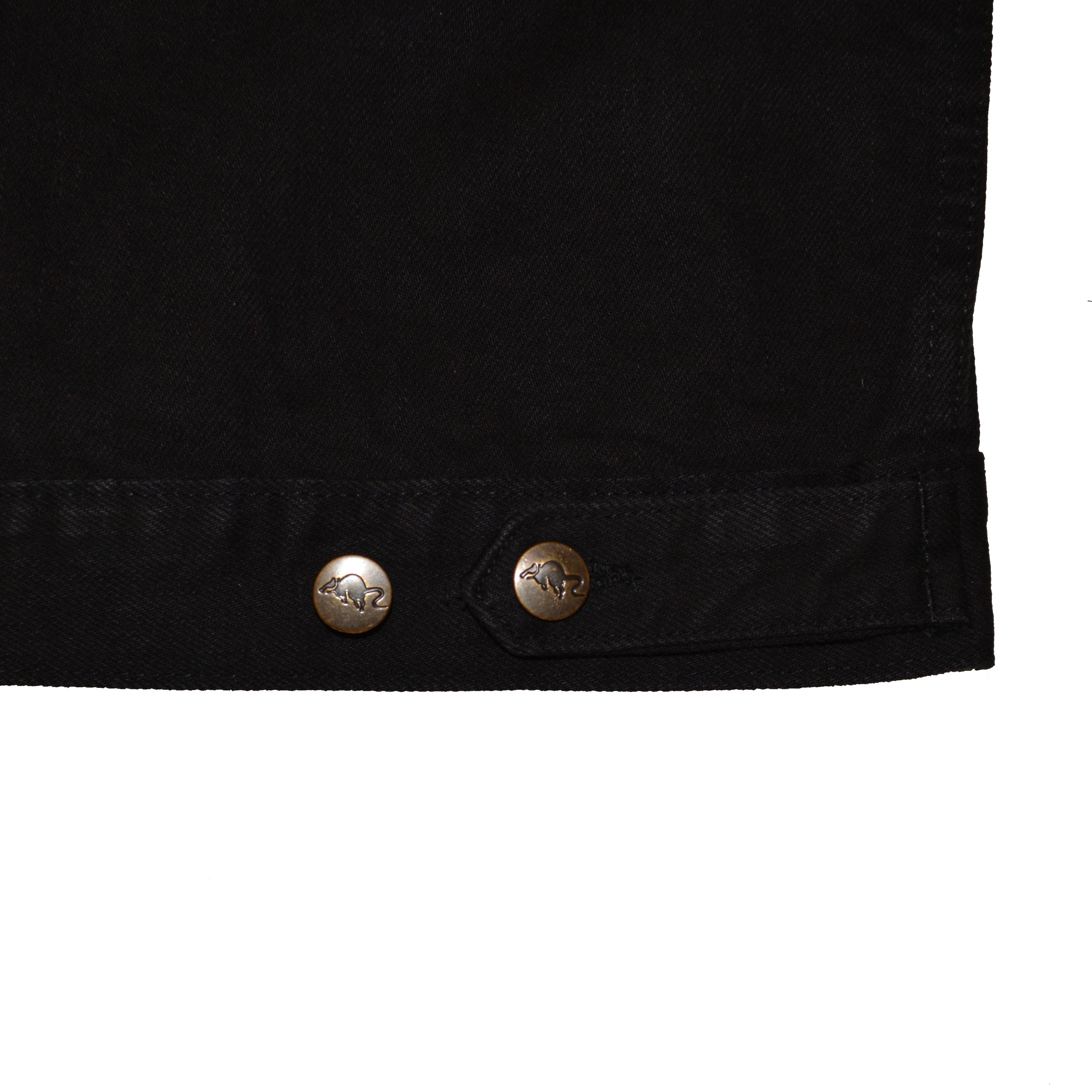 100% thick black denim jacket with rat buttons. Equipped with 8 pockets (and thus able to conceal 10 cans of your favourite beverage). Two of them with coarse zippers on the inside.