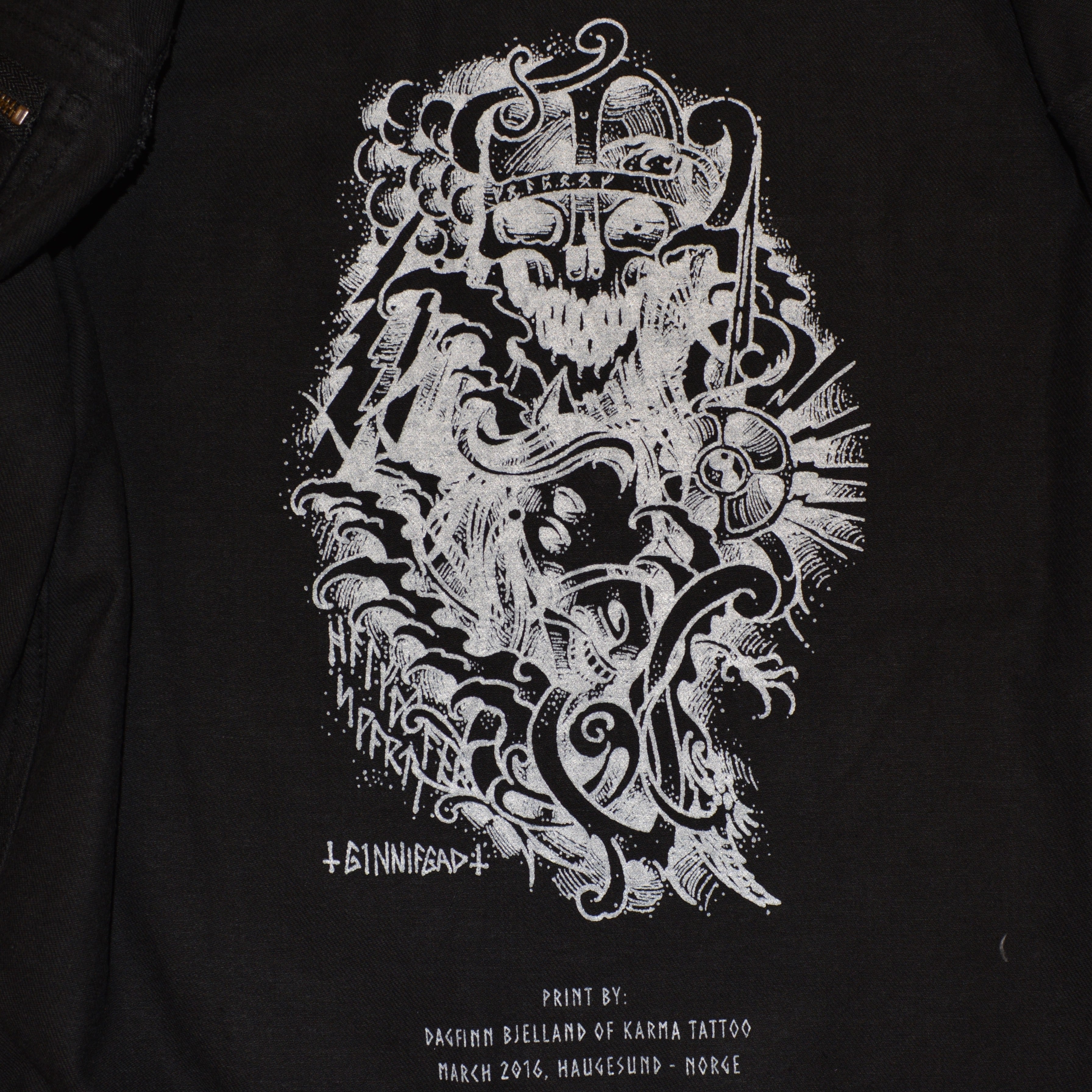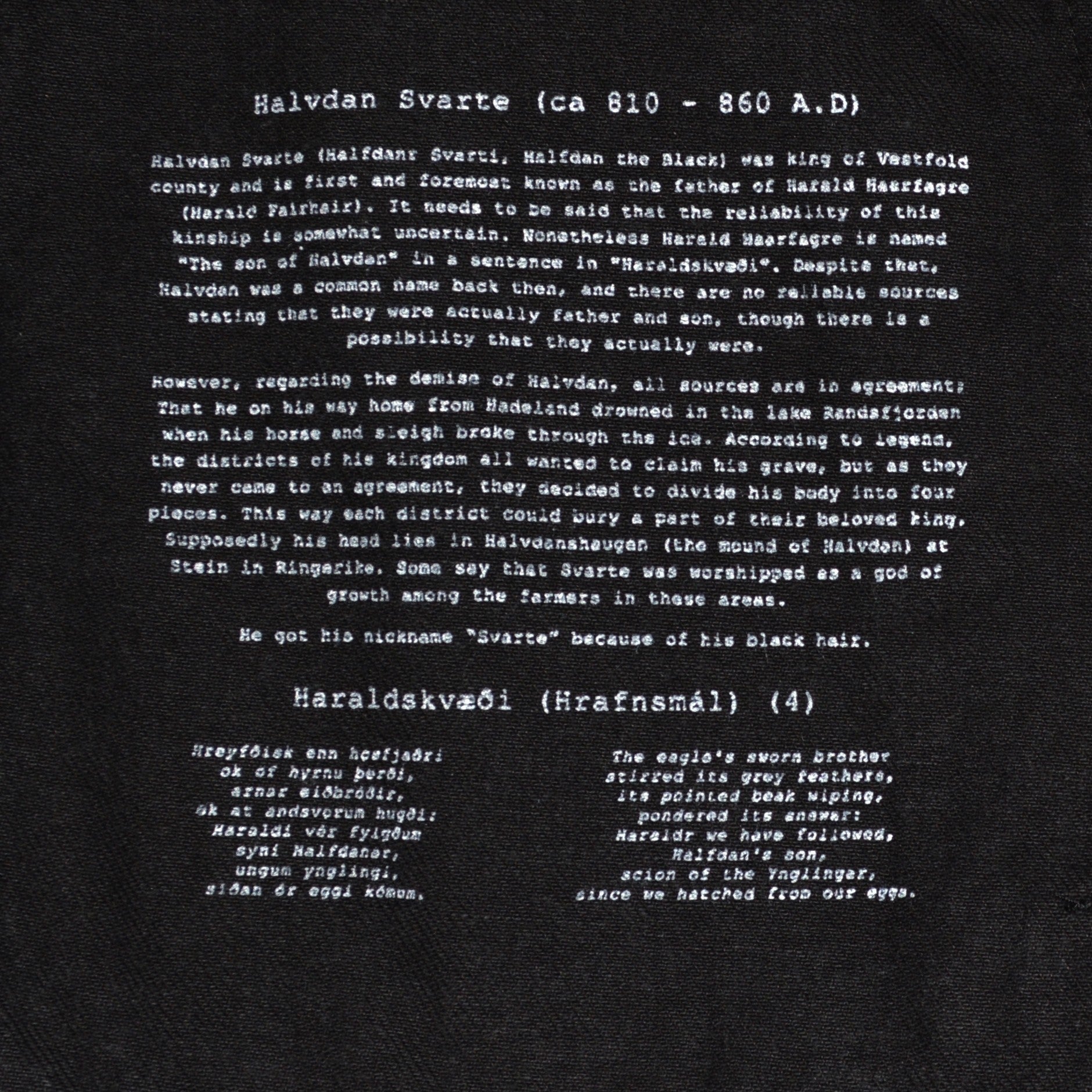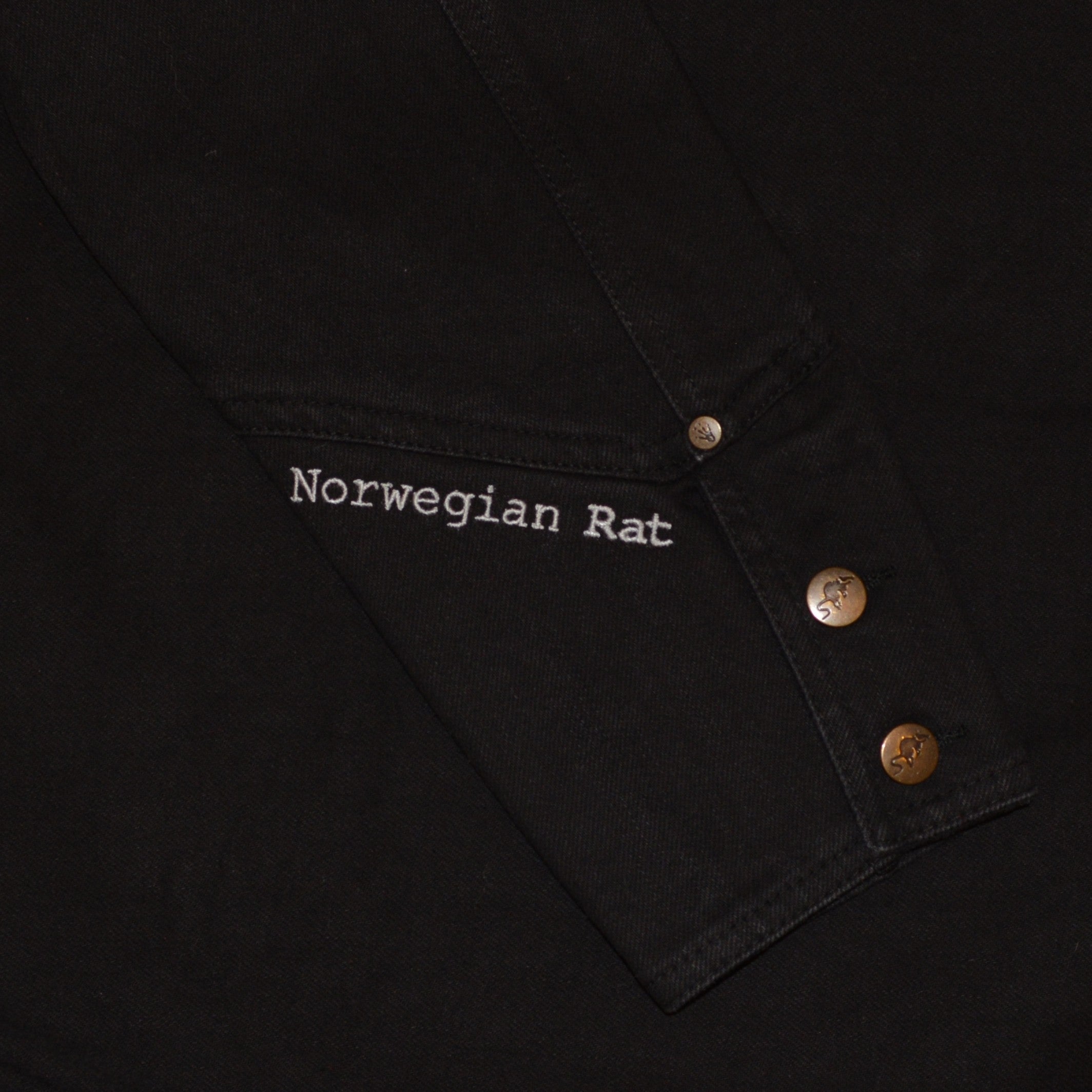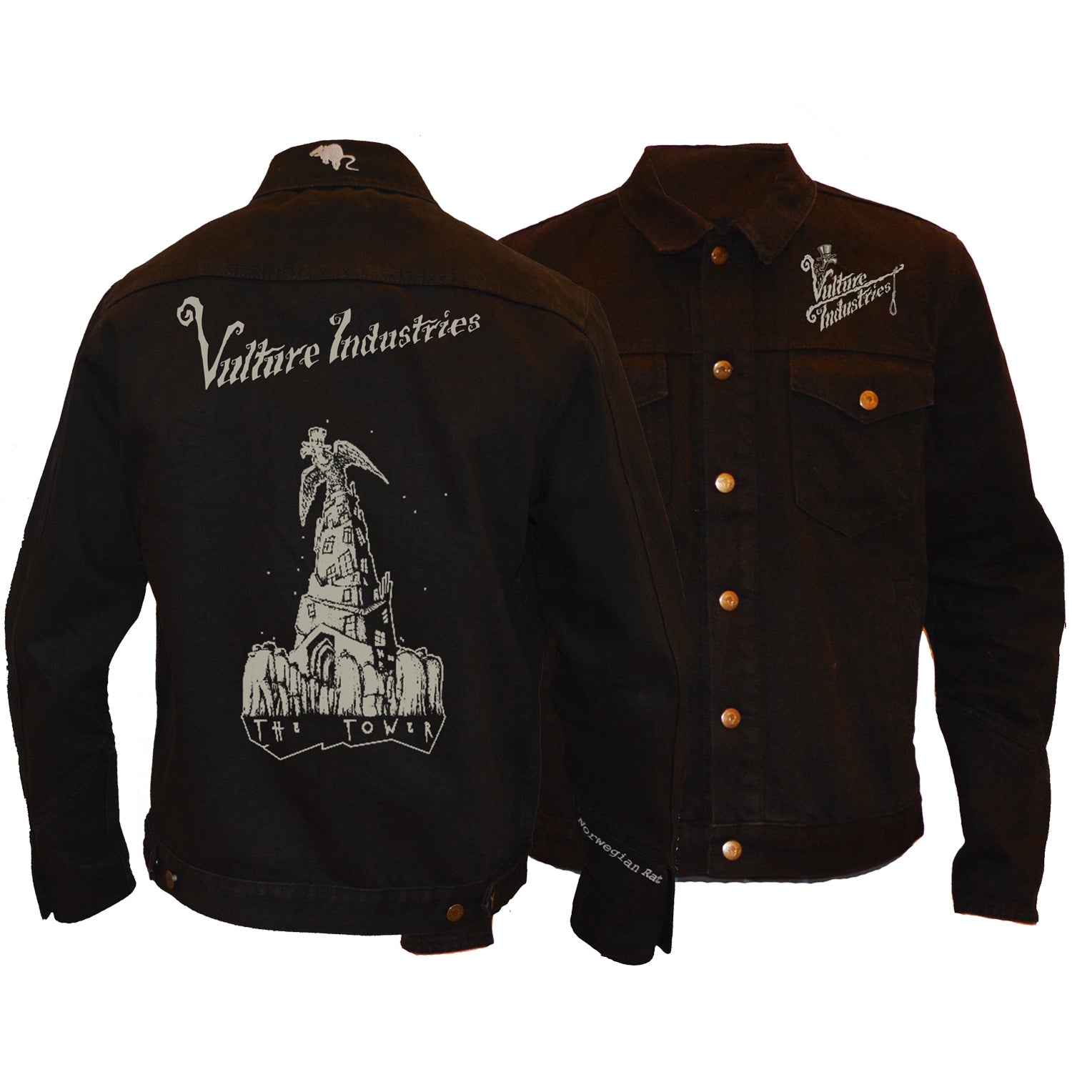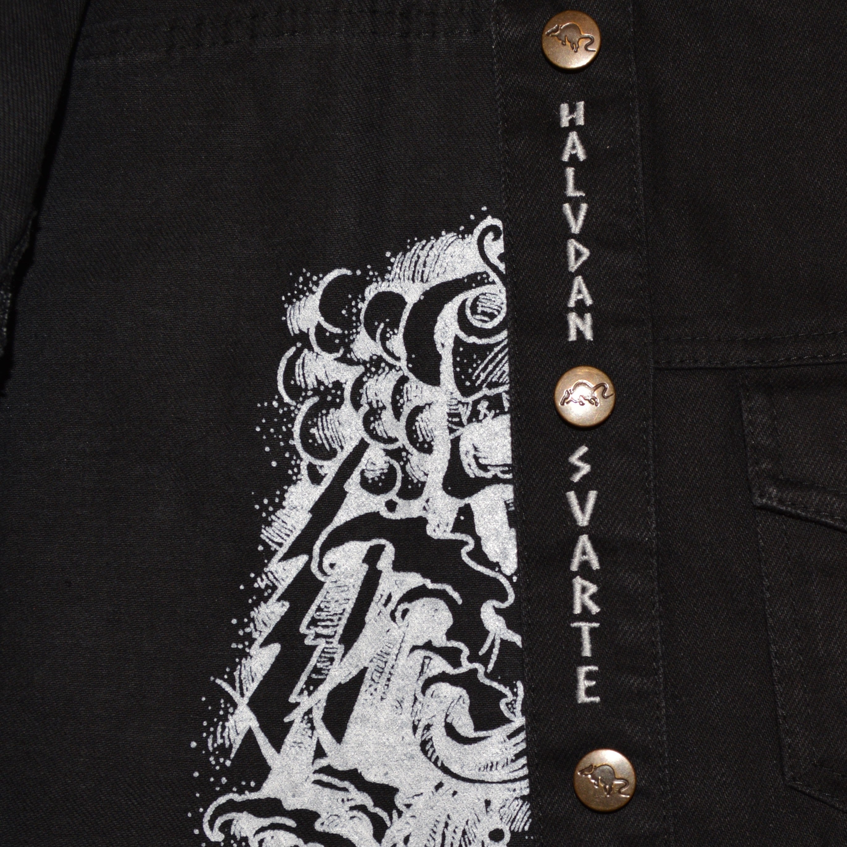 100% thick black official Vulture Industries denim jacket. Everything embroidered and with custom rat buttons and 8 pockets. Two of them with coarse zippers on the inside. This jacket is named after Halfdan the Black, a Norwegian viking earl who drowned in the lake Randsfjorden when his horse and sleigh broke through the ice.